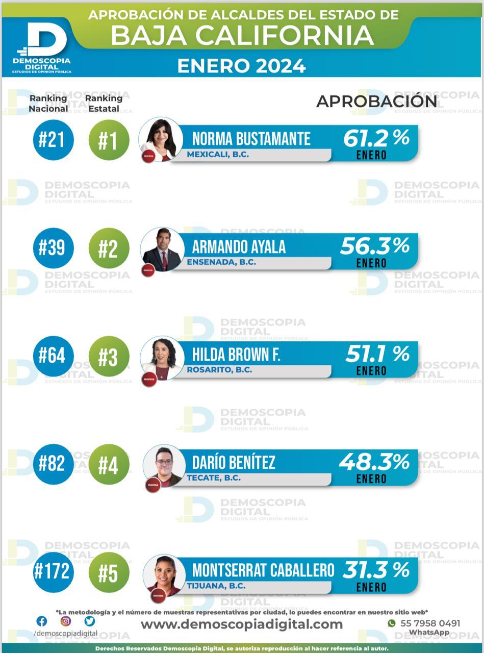 De acuerdo al último estudio de opinión pública realizado por Demoscopia Digital en el mes de enero, la alcaldesa de Mexicali Norma Bustamante se posiciona como la mejor evaluada en Baja California con un 61.2% de aprobación.