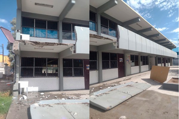 La Dirección de Infraestructura Escolar y Protección Civil del Estado visitaron el plantel derivado de la caída de una sección del barandal de concreto en uno de los módulos de aulas, ahí observaron daños provocados por filtraciones de agua, acero expuesto con oxidación, carbonatación en concreto lo que genera humedad y salitre , entre otras situaciones que se presentan en la citada escuela, por lo que se determinó que no es seguro la presencia de los estudiantes ahí.