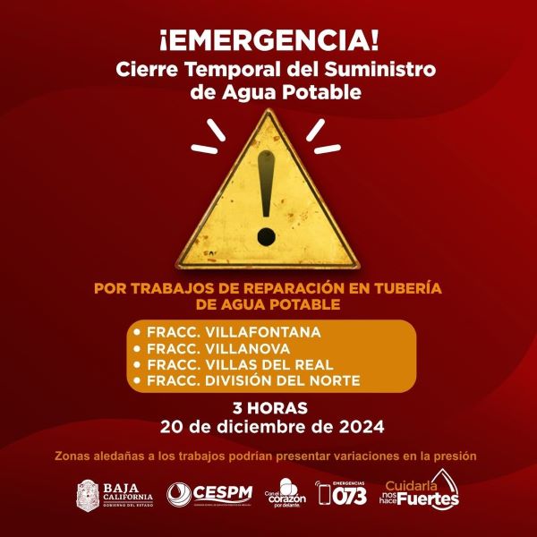 MEXICALI.- Desde las 11:00 horas aproximadamente, miles de mexicalenses residentes de San Marcos, Villafontana, Villanova, Villas del Real y División del Norte, entre otras colonias, están sin el servicio de agua potable por reparaciones que realiza la CESPM.