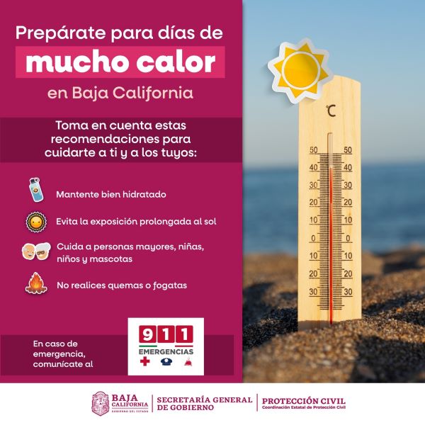 MEXICALI.– La Coordinación Estatal de Protección Civil (CEPC) advierte que, de acuerdo con el pronóstico del Servicio Meteorológico Nacional (SMN) del miércoles 9 al viernes 11 de julio se mantendrán temperaturas elevadas en diversos Municipios de Baja California, principalmente en Mexicali y San Felipe.