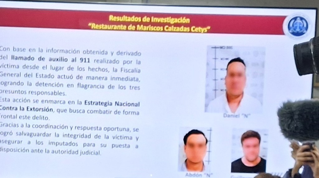 Uno de las víctimas que estaba dispuesto a pagar cierta cantidad de dinero, dado el temor infundido, grabó una conversación y se atrevió a llamar al 9-1-1 mientras Daniel, Abdón y Guillermo lo extorsionaban en el interior de un restaurante de mariscos ubicado por Calzada Cetys hasta donde llegaron agentes estatales para detener a los delincuentes y liberar a la víctima.